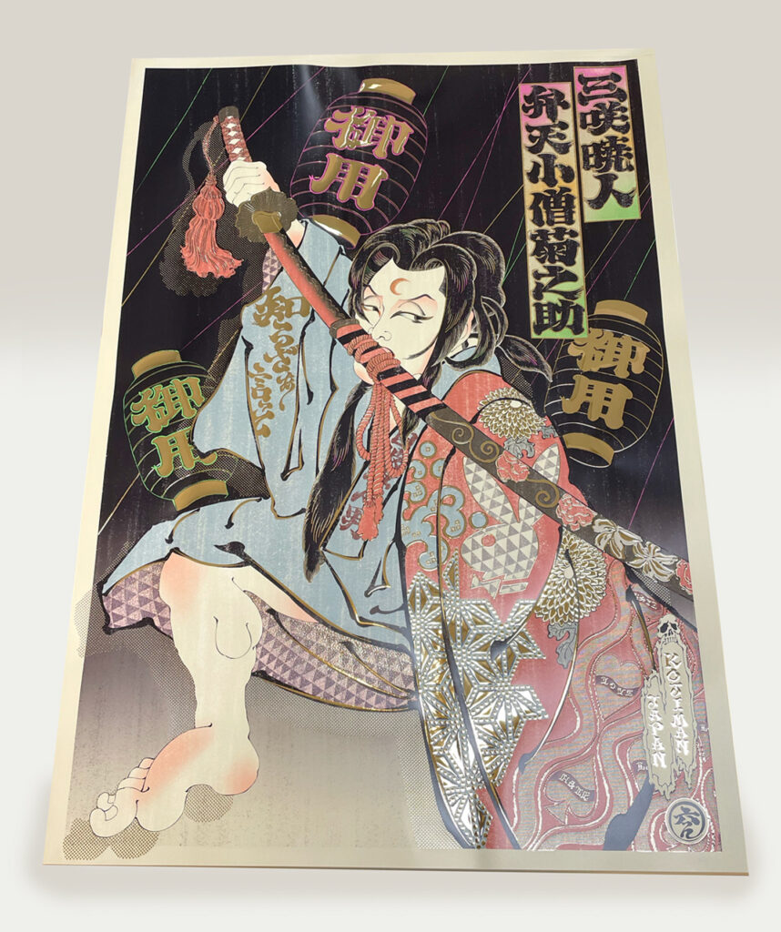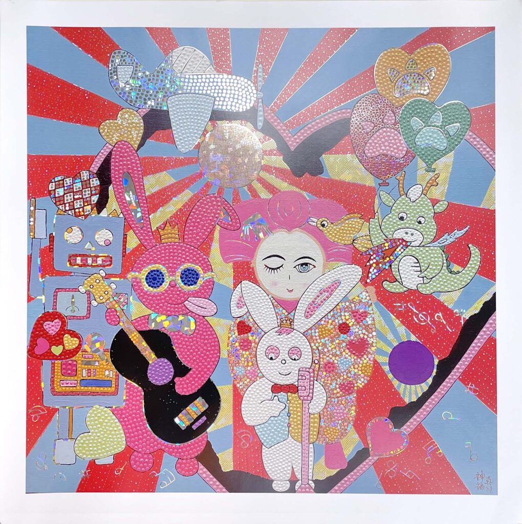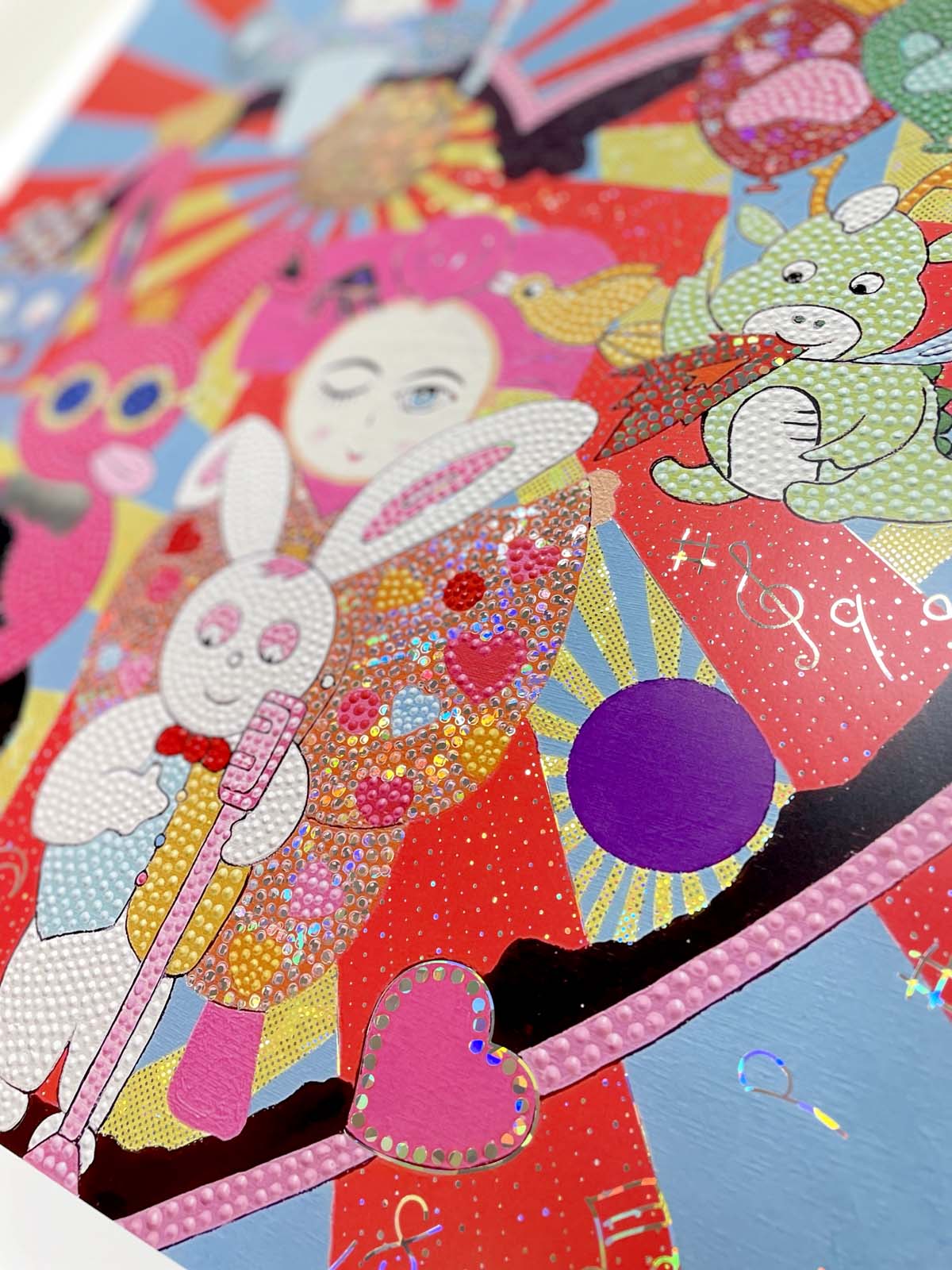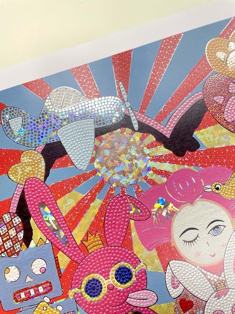 作品の複製原画に箔をあしらいました。そのままでも色鮮やかで元気の出そうな可愛らしい作品ですが、ホログラム箔を使用した事で、角度により華やかさが変化し立体感のある仕上がりになっています。