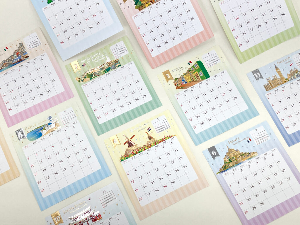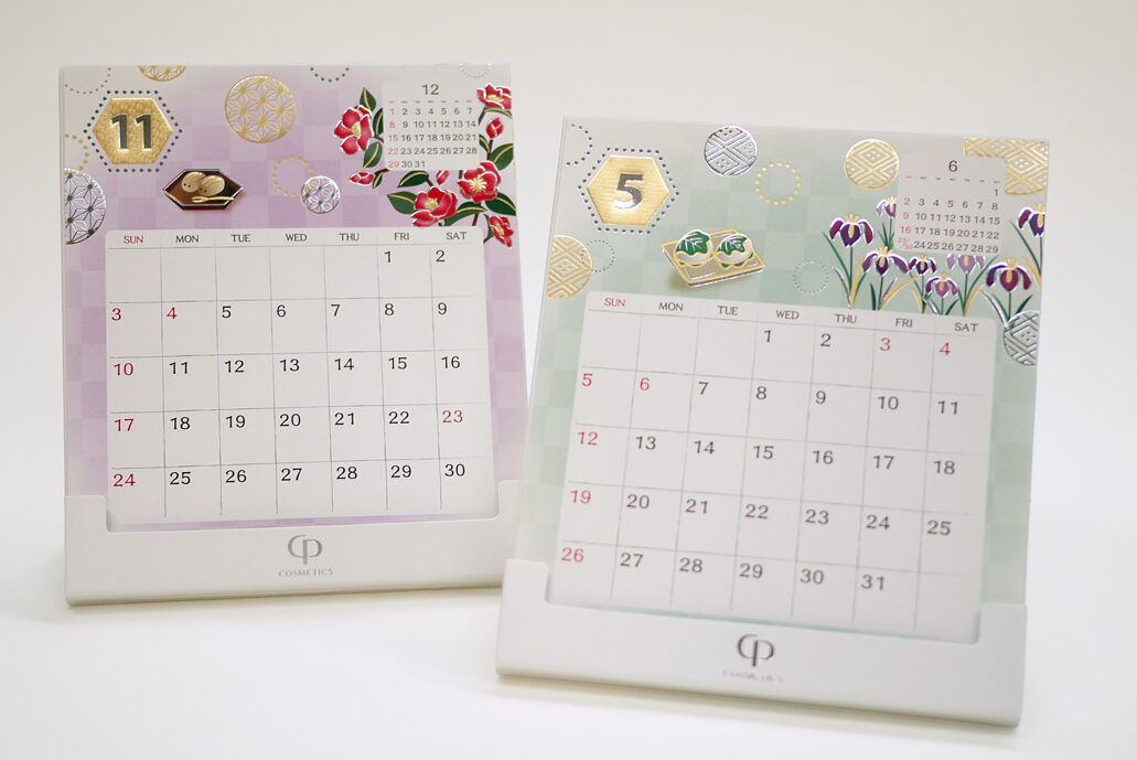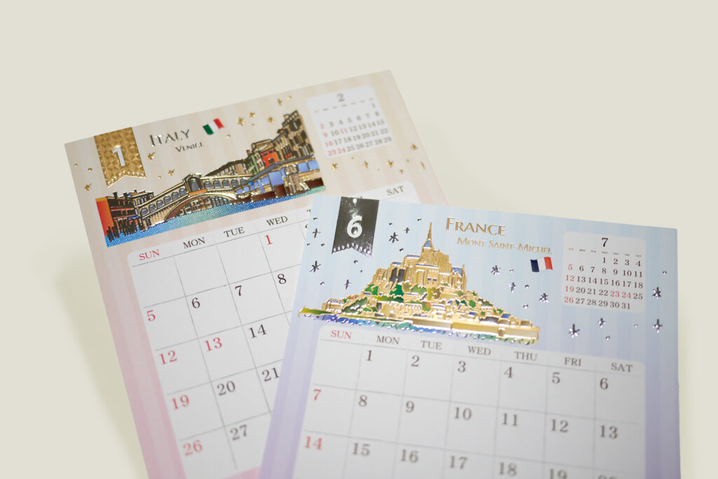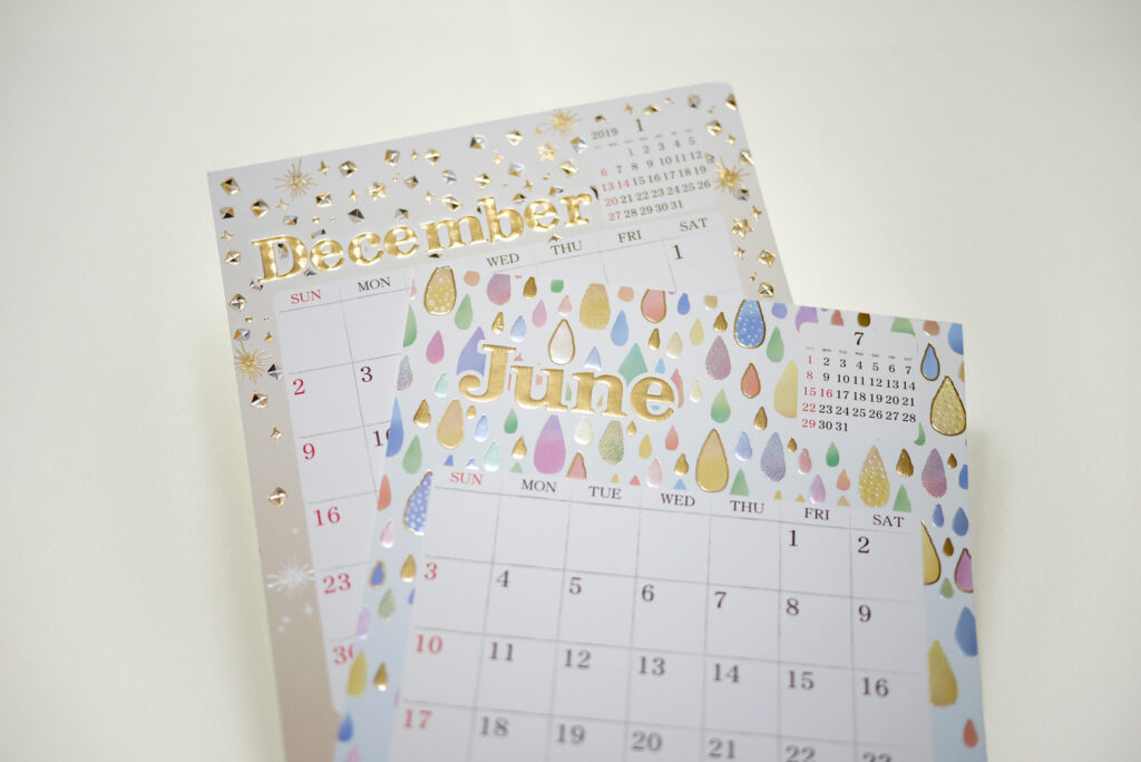 デザイン、箔あしらいから、生産までトータルで手掛け、日常に寄り添いながら、ふとした瞬間に眺めて楽しんでもらえるようなカレンダーに仕上げました。
